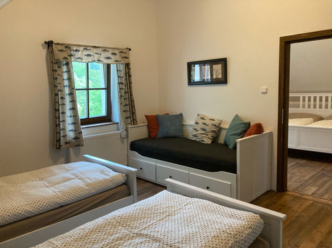 Our guests have at their disposal parking in front of the building, a common room with a fully equipped kitchen, an outdoor seating area with a barbecue, a children's playground and a lockable bicycle shed. The apartments are suitable for families with children, as well as for all who want to experience the amazing atmosphere of South Bohemian nature in all seasons. Access to the building and all apartments is solved by an automatic access system on the principle of a unique PIN, you are not limited by the time of arrival or departure.